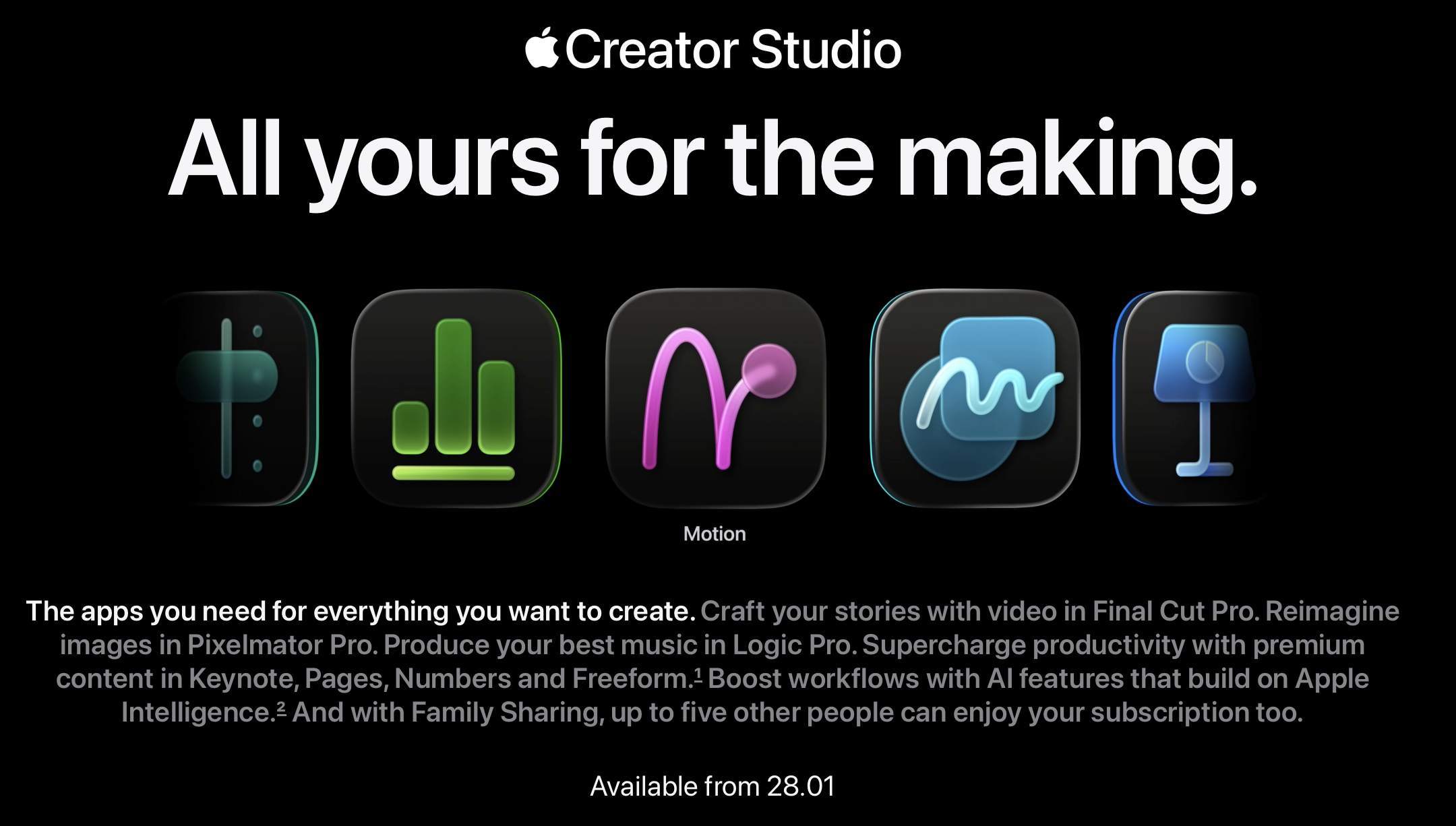 It turns out that Apple's buy-once software model wasn't going to last forever. This week Apple announced Creator Studio, a new subscription bundle launching on January 28th. For $12.99 per month (or $129 per year), you get access to Final Cut Pro, Logic Pro, Pixelmator Pro, Motion, Compressor, and MainStage, along with premium features in Keynote, Pages, and Numbers. There's also a student and educator tier at $2.99 per month.