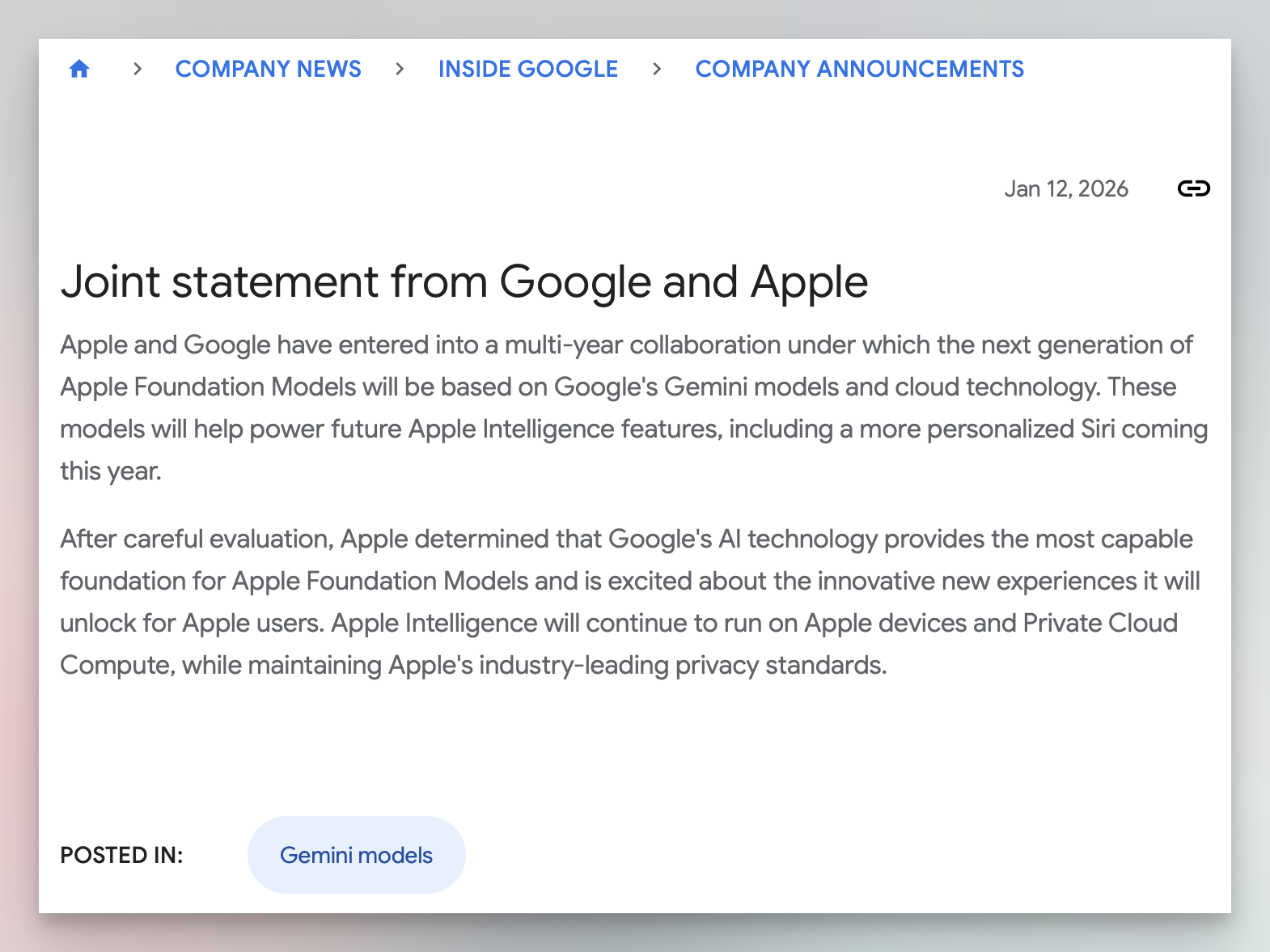 It's official. After months of rumour and speculation, Apple has confirmed a multi-year partnership with Google. The next generation of Apple's Foundation Models will be built on Google's Gemini technology. That includes the long-promised Siri overhaul. This is a significant moment, not because tech companies don't regularly partner with each other, but because of what this deal says about where Apple now sits in the AI race.