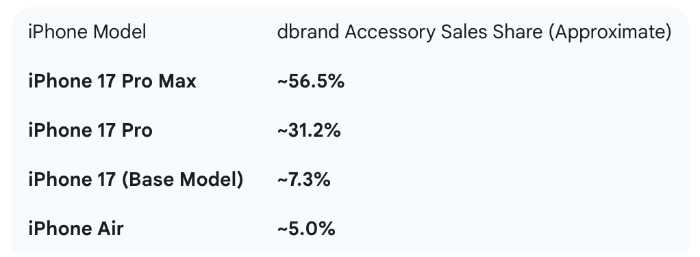 An interesting extra data point came from MKBHD, who shared sales breakdowns from his collaboration with dbrand, the popular case and skin manufacturer. According to their data, the iPhone 17 Pro Max accounted for 56.5% of case sales, followed by the 17 Pro at 31.2%. The regular iPhone 17 made up 7.3%, with the iPhone Air trailing at just 5%. And while that’s just case data, it’s still a decent indicator of demand — and it’s not a great look for Apple’s newest iPhone.