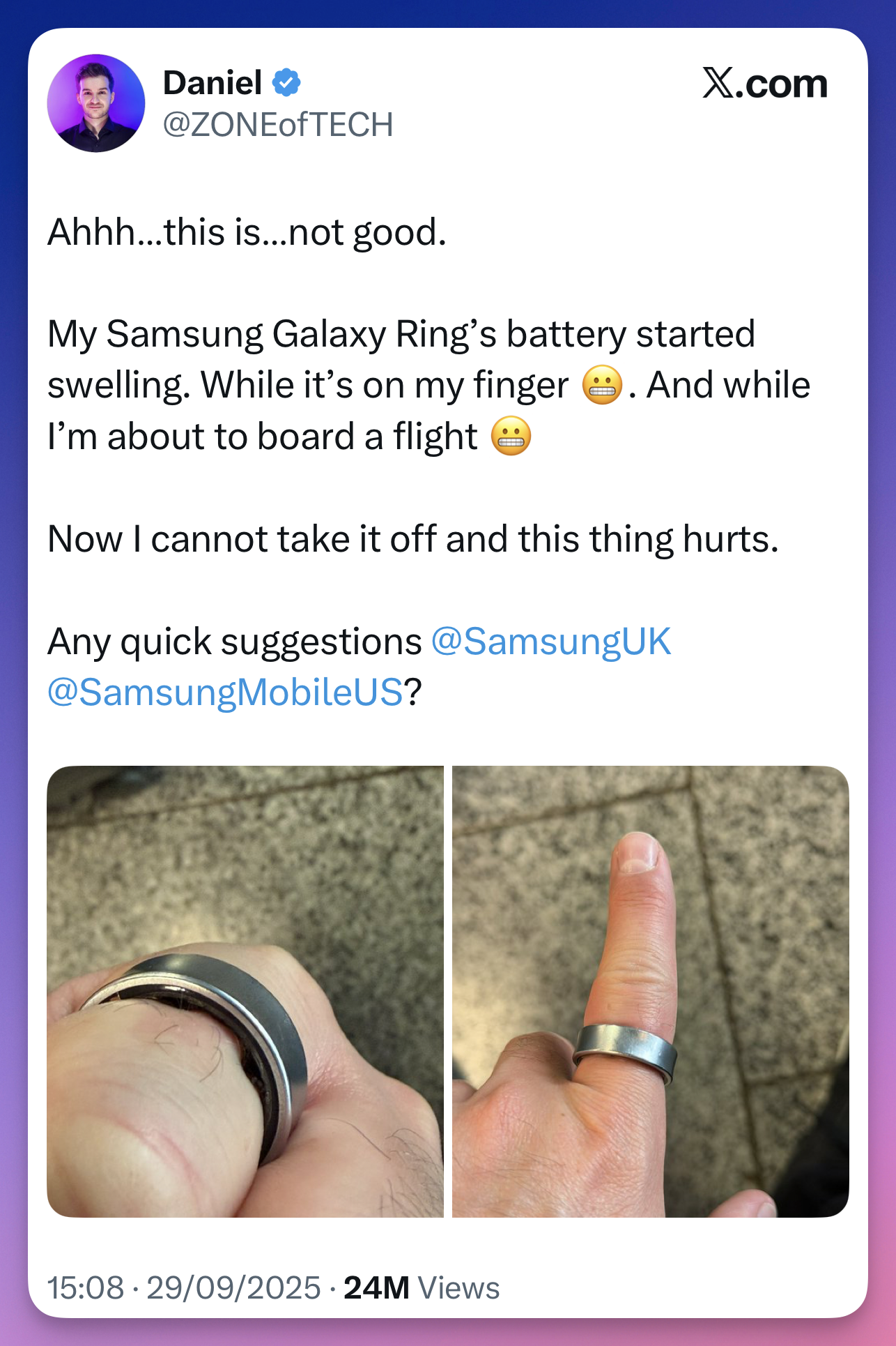 But a much more troubling story that could have implications for Apple should they ever move into the smart ring space, which has been rumoured for some years now, is the situation involving Samsung’s Galaxy Ring. A tech YouTuber, Daniel Rotar from Zone of Tech, was travelling when the battery inside his Galaxy Ring swelled up while he was wearing it. The swelling caused the ring to tighten on his finger, to the point where he was denied boarding on his flight and had to go to hospital to have it removed. Doctors eventually freed the device using a combination of ice and lubricant, but the situation was described as painful and distressing. He has since said he won’t be wearing a smart ring again.