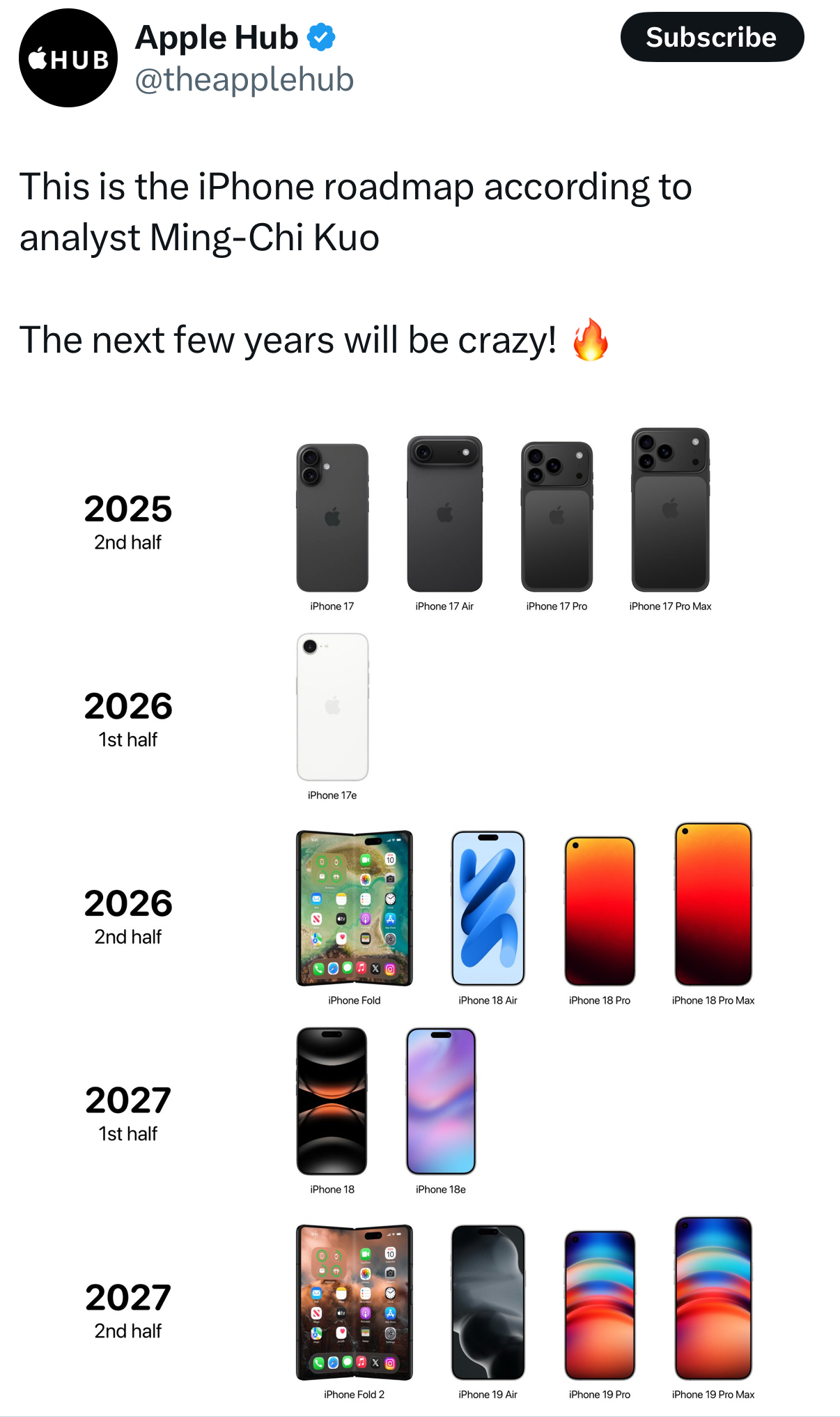 Popular Apple-related Twitter account Apple Hub earlier this week released an image that they claim is a visual representation of the iPhone roadmap, as laid out by renowned Apple analyst Ming-Chi Kuo, covering the second half of this year through to the end of 2027. And if accurate, the image certainly makes for some interesting reading.
